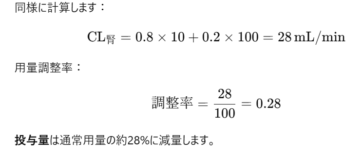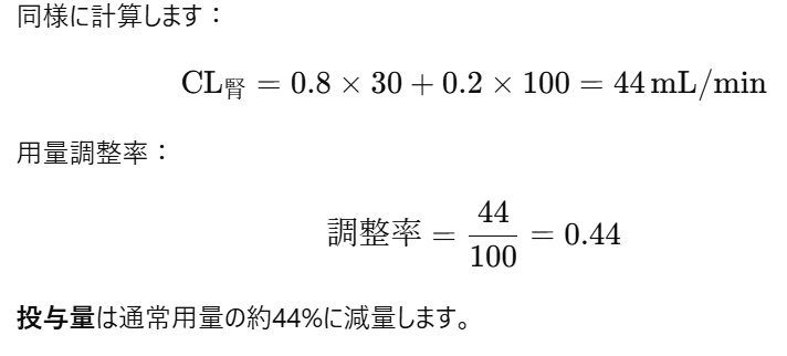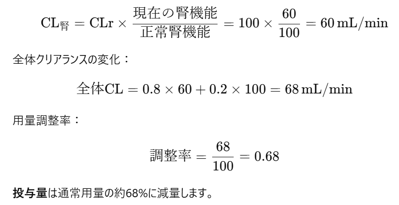 腎排泄型薬物の用量調整は腎クリアランスの割合を考慮して行います。腎排泄率が80%であるため、腎機能低下が薬物クリアランス全体に与える影響を計算します。