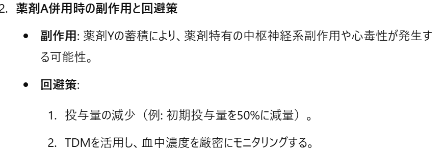 2.薬剤Aとの併用において発生する可能性のある副作用を挙げ、その回避策を提案してください。
